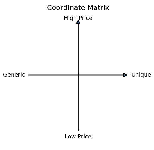 Một doanh nhân muốn tìm cơ hội trong ngành F&B cạnh tranh khốc liệt, để phân tích thị trường, có thể tiếp cận với một ma trận với hai trục: Trục 1: Giá cả (Cao/Thấp) và Trục 2: Sự độc đáo (Độc đáo/Phổ thông). Sau đó, ta chấm vị trí của tất cả các chuỗi nhà hàng hiện có lên ma trận.