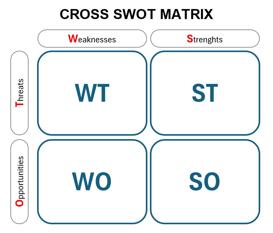 Thậm chí, mô hình này còn được phát triển thành “Cross SWOT” (SWOT chéo) để xây dựng chiến lược sâu hơn, bằng cách sử dụng “Ưu thế/Khuyết điểm” và “Cơ hội/Thách thức” làm hai trục mới.