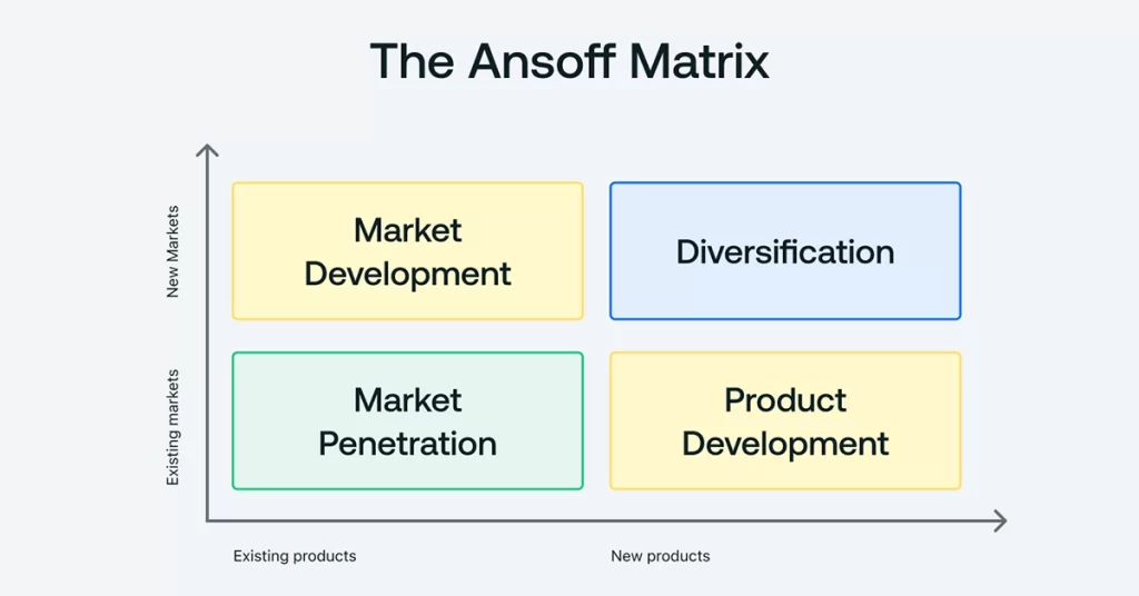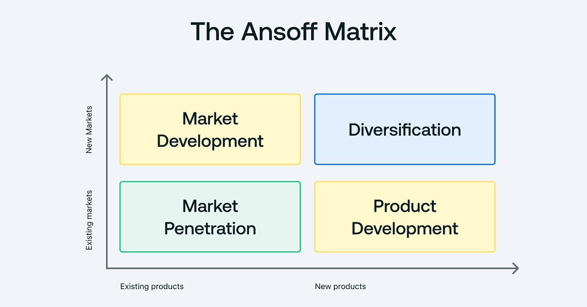 Bốn góc phần tư của ma trận này đại diện cho các chiến lược mở rộng với mức độ rủi ro khác nhau, từ thấp nhất (thâm nhập thị trường – Market Penetration, sử dụng sản phẩm hiện có trên thị trường hiện có) đến cao nhất (đa dạng hóa – Diversification, sử dụng sản phẩm mới trên thị trường mới). Việc này giúp C-level đưa ra quyết định có Logic về việc phân bổ nguồn lực và chấp nhận rủi ro.