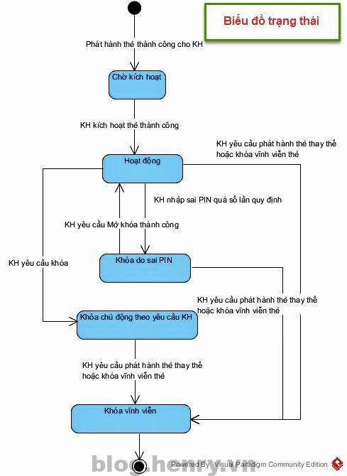 Với State Diagram thì nó thể hiện luồng chuyển đổi trạng thái của 1 thực thể, hay nói cách khác vòng đời của 1 thực thể. Ví dụ như biểu đồ trạng thái thẻ ATM mà mình đính kèm, nó thể hiện từ lúc thẻ phát hành cho KH, tới lúc thẻ khóa vĩnh viễn và không sử dụng được nữa. Bạn có thể tham khảo biểu đồ trạng thái bên dưới.